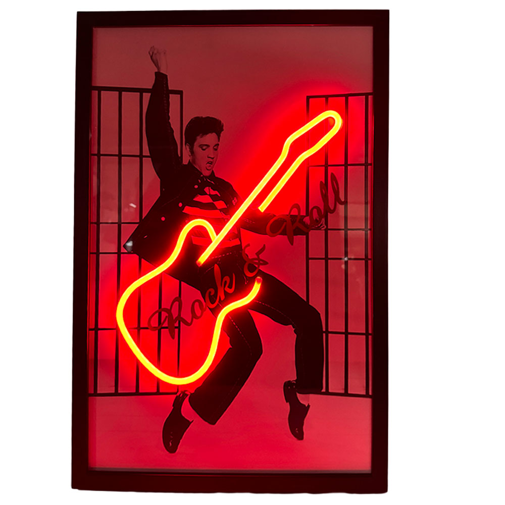 This striking 40x60cm framed neon art captures the King himself — Elvis Presley — mid-jump in his iconic Jailhouse Rock pose. Set against a high-contrast black-and-white photo, a red neon guitar and cursive “Rock & Roll” glow boldly across the front, creating a vivid clash of retro energy and modern LED brilliance.
