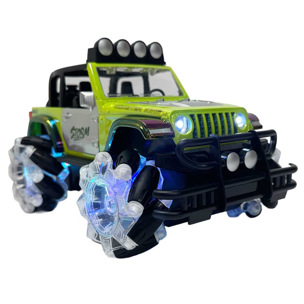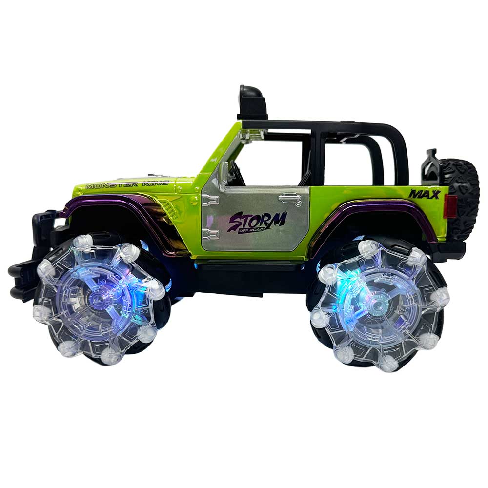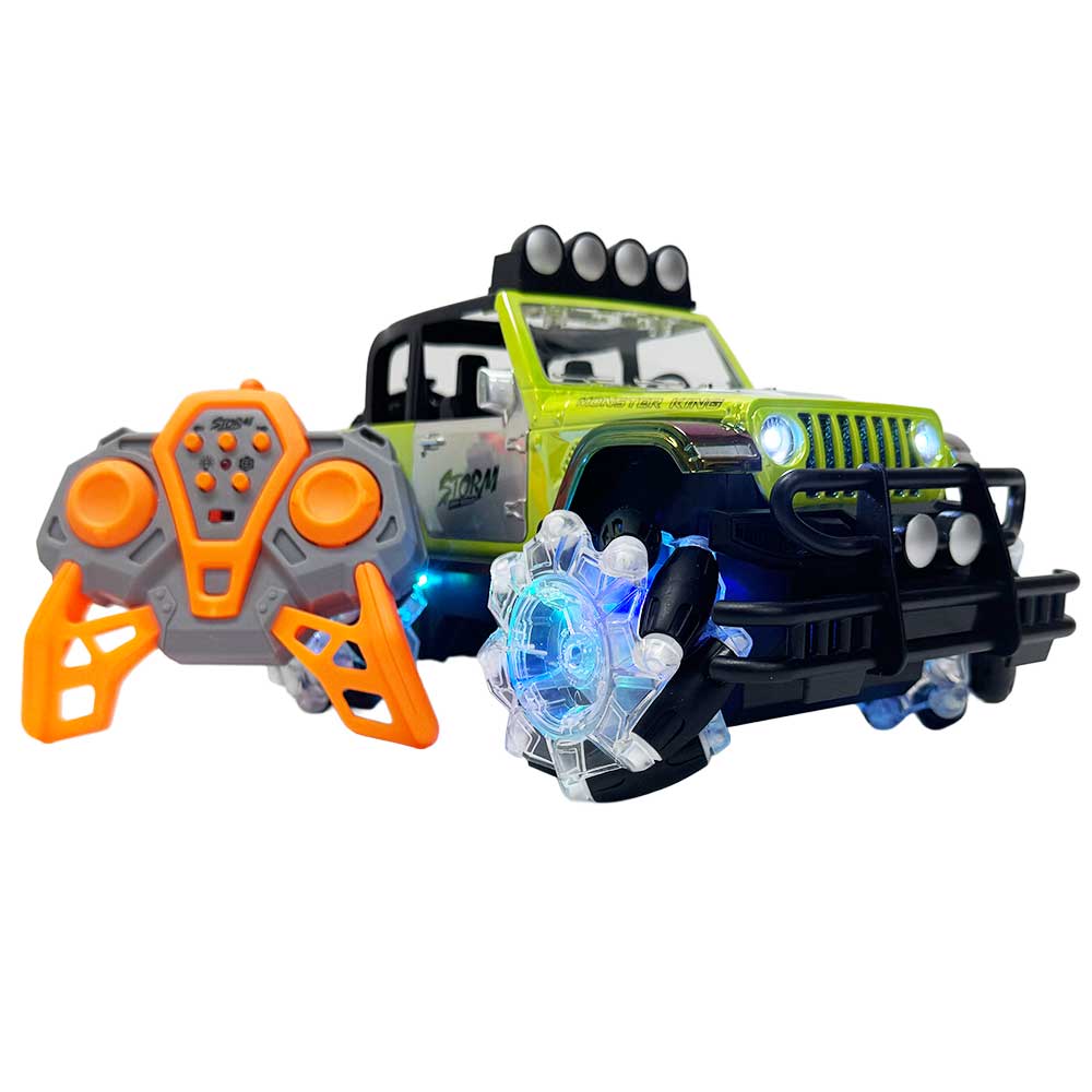 Bring the show to your driveway. This chunky 1:14 scale off-road “Storm” 4x4 lights up the night with clear stunt wheels packed with multicolour LEDs, a glowing grille and opening doors. The 2.4 GHz transmitter gives smooth, interference-free control, while the included 3.7 V rechargeable battery keeps the fun rolling. It’s easy to drive, tough enough for backyard adventures and flashy enough to steal the spotlight.