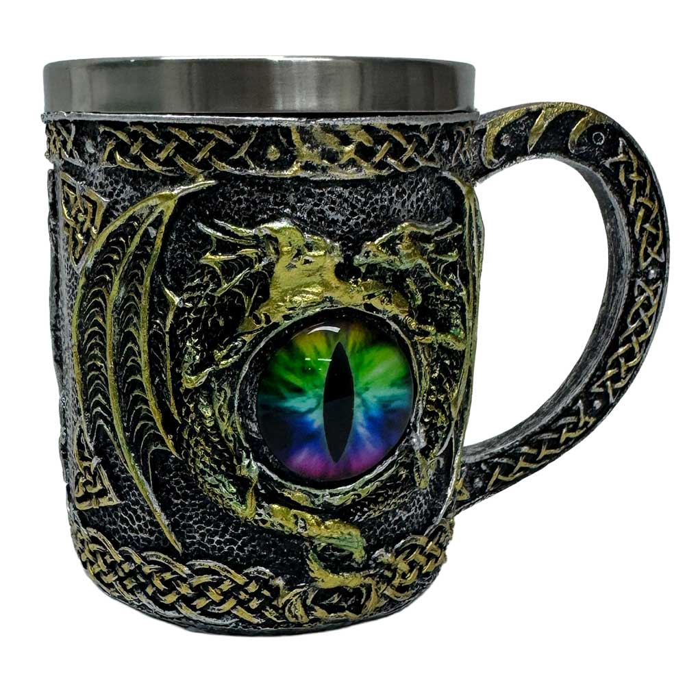 The Dragon Eye Tankard is no ordinary vessel — it’s a cursed relic pulsing with ancient energy. Featuring a textured dragon scale exterior and a piercing 3D reptilian eye embedded in its centre, this mug blends high fantasy with gothic horror. Carved with claw marks, mystical sigils, and battle-worn scales, it’s a drinkware piece that’s impossible to ignore. Whether you're raising a toast to your guild or just showing off your collection, this tankard demands to be held — and feared.