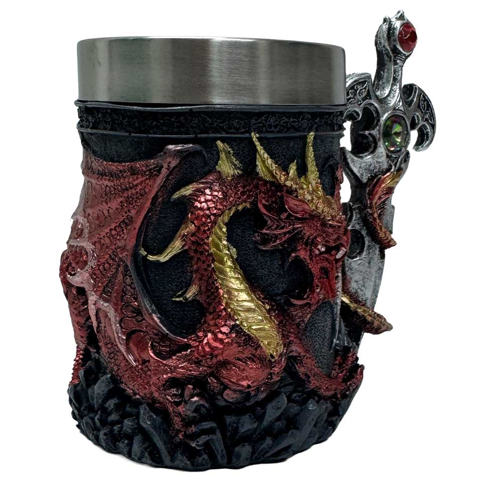 Born of fire and forged in shadow, the Dragon Sword Tankard is a fierce tribute to warriors who’ve faced both blade and beast. Featuring a dramatic black-and-red palette, this tankard is carved with dragons entwined around ancient swords — a symbol of eternal battle, blood oaths, and arcane might. With its stainless steel interior and thick resin shell, this vessel is built for drinkers who walk the line between legend and war.