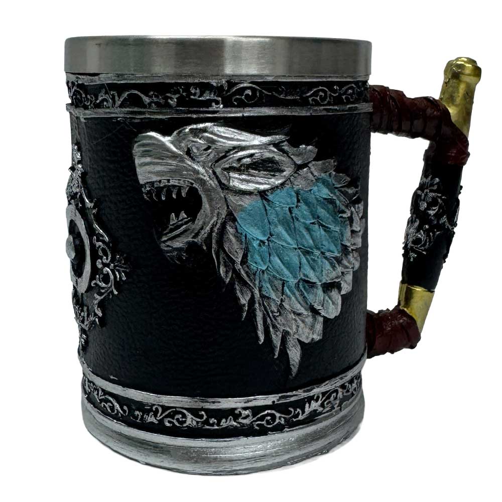 Answer the ancient call with the Howling Wolf Tankard — a tribute to nature’s raw power and midnight mystery. Featuring a majestic wolf howling beneath a full moon, framed in antique gold and surrounded by forest carvings, this mug captures the spirit of the wild in every detail. Crafted from durable resin with a stainless steel liner, it’s the perfect blend of rustic strength and gothic elegance.